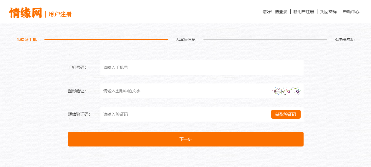 步驟一:填寫未注冊過的手機號、填寫圖形驗證碼,點擊“獲取驗證碼”按鈕,將收到的短信中6位數字驗證碼填寫至“短信驗證碼”輸入框,點擊下一步;